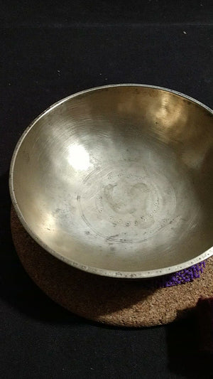Manipuri bowl is the Wedding Bowl. The father of the bride would have made for his daughter's dowery. This is a very small precious Manipuri bowl. We wonder where is this bride now and how many children has she had. You can see all the markings at the center and then all along the tip of the rip. This hand work you can see was done with love. When we are on a deep focus state of consciousness, this you can see the mind is not distracted. The bowl maker was at one with the universe.